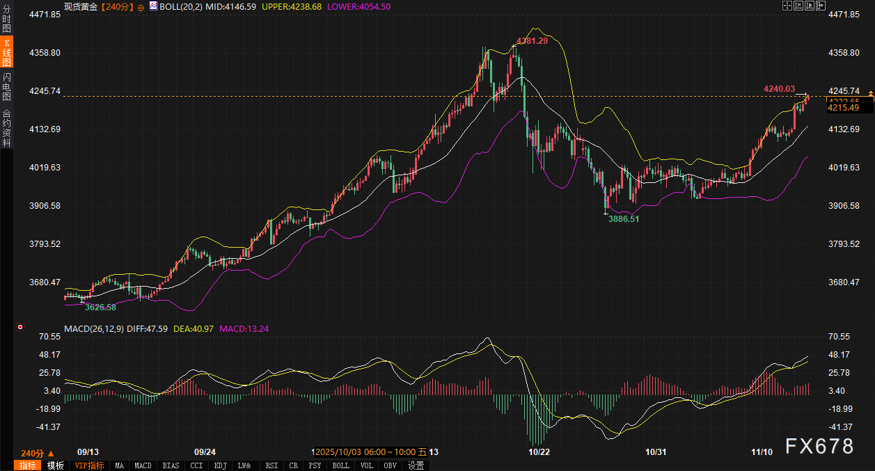 黄金的技术面表现最为强劲。240分钟图上,金价强势运行于布林带上轨4238.30美元/盎司附近,布林带明显向上开口,显示上涨动能充沛。MACD指标DIFF和DEA值分别为47.59和40.98,远高于零轴,且DIFF高于DEA,确认了短期的多头趋势。当前,4238美元(布林带上轨)构成近期首要阻力,若能有效突破,则可能进一步上探。下方支撑首先关注4146美元(布林带中轨),更关键的支撑区域在4050-4070美元一带(前期整理平台及布林带下轨)。黄金的强势得益于避险情绪和对美联储潜在降息预期的双重推动。盘中需观察其对关键阻力位的攻击情况,以及美元和美债收益率的联动影响。