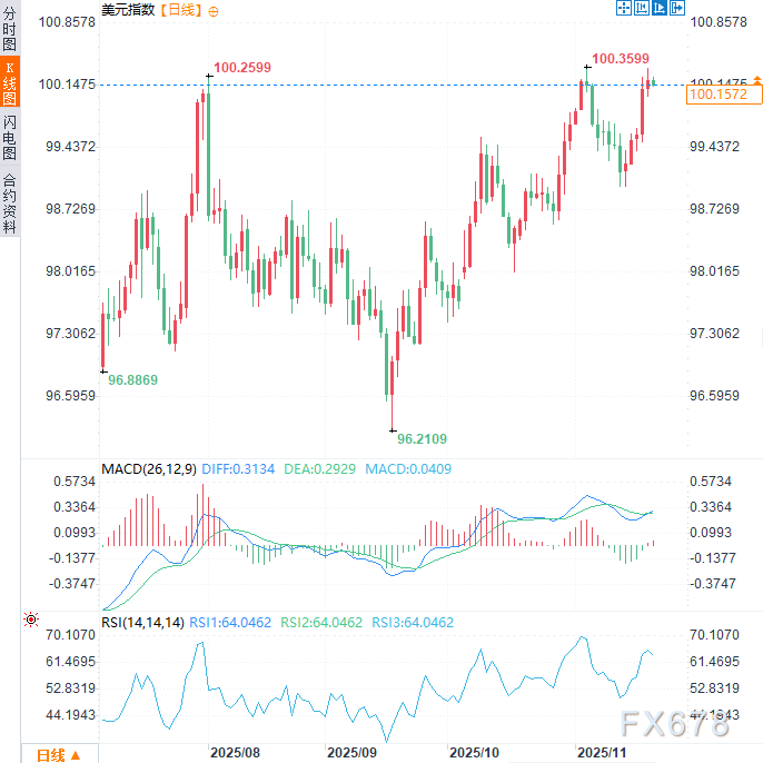 周五美元指数于100.15附近震荡,稳居100关键整数关口上方,此前曾五个交易日上涨,目前处于近半年高点附近下方震荡。