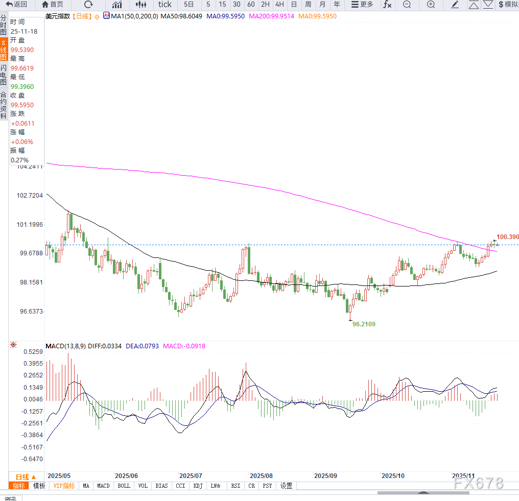 美元指数(DXY)日线图显示,价格在连续五日上涨后于100.50附近遇阻,当前呈现高位横盘与技术性回调的结构。短期9日与20日均线依旧维持多头排列,反映趋势中枢仍偏向上行,但MACD红柱缩短、快线出现放缓迹象,显示动能正在减弱。