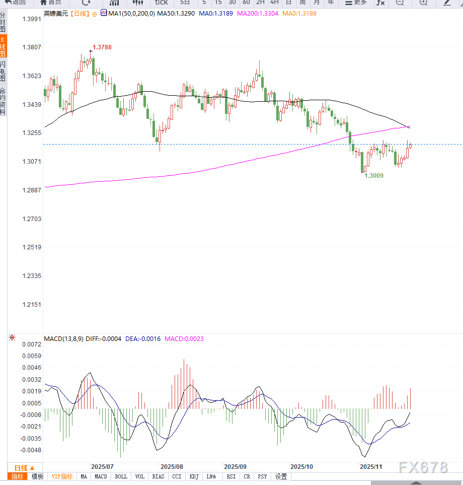 14日RSI位于强势区但未触及极端高位,说明上涨节奏虽强但未出现明显过热迹象。若价格继续企稳,可进一步上看1.3250与1.3300两个延伸阻力;反之,若跌破1.3120,短期涨势可能进入整理阶段。整体来看,技术面与基本面共振,英镑仍维持偏强结构。