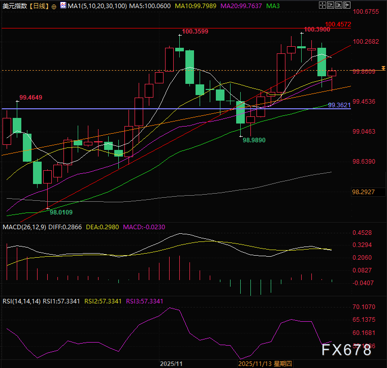 但结合基本面,即近期美国数据和美联储官员发言对12月降息的押注的提升,叠加俄乌关系缓和以及美国政府停摆风波未停,政府债务联创新高的现实条件,美元指数可会经历抵抗式下跌后逐步跌破这三条关键支撑线。