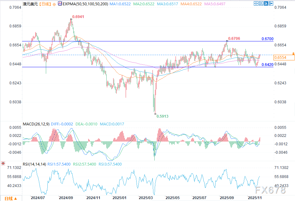 澳大利亚最新通胀数据超预期升温,推动澳元/美元汇率走高。澳大利亚统计局数据显示,10月核心通胀率升至3.3%,高于市场预期的3.0%。这一数据已超出澳联储(RBA)2.0%的通胀目标,表明央行可能维持更鹰派的政策立场。与此同时,对分析师的另一项调查显示,尽管劳动力市场有所疲软,但房价仍将上涨约7%。因此,部分分析师预测,澳联储不仅会在今年最后一次会议上维持利率不变,还可能加息25个基点,以遏制通胀进一步上行。
