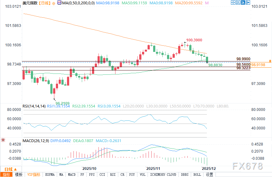 汇通财经APP讯——周三(12月3日)欧盘时段,美元指数遭遇显著抛压,空头趋势清晰可见。指数跌破50日均线关键支撑位99.117后,该水平已转化为新的阻力位;随后进一步失守98.991的震荡低点,进一步强化了下行动能。在国债收益率持续走低、市场坚定押注下周美联储将再度降息的背景下,美元缺乏实质性基本面支撑。