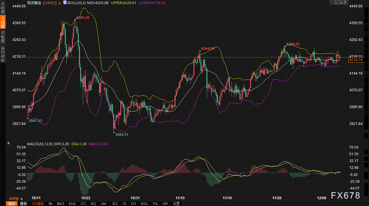金价在创出新高后回落,但仍稳居关键均线上方。240分钟图显示,价格位于布林带中轨(4203.89)之上,整体上行结构未破坏。