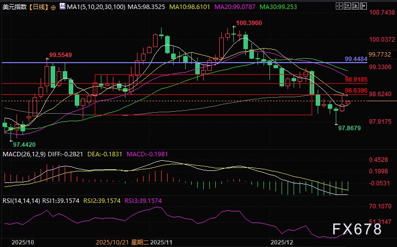 技术面,美元指数依托5日线反抽箱体50%分位,支撑位为5日线和箱体底部的98.10压力位为98.63和98.91。