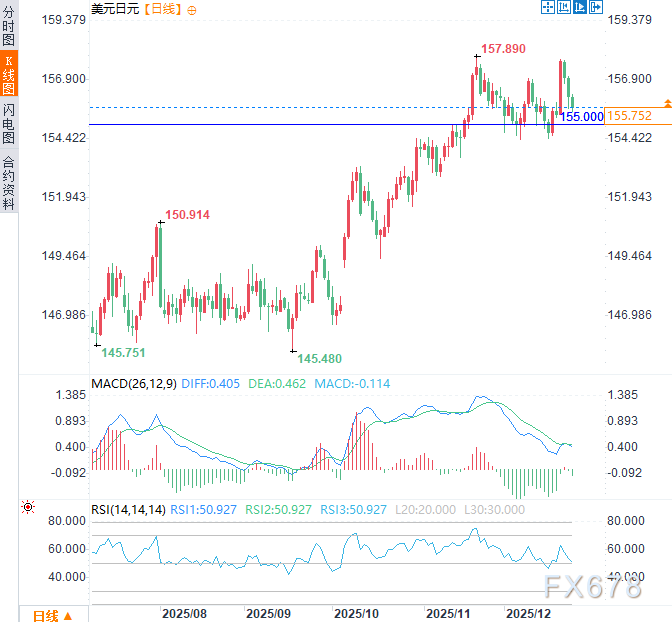 汇通财经APP讯——美元兑日元周三(12月24日)亚欧交易时段延续下行态势,连续第三个交易日走低,日内跌幅约0.30%,日本央行10月货币政策会议纪要显示,政策委员会成员就继续加息的必要性展开辩论。此外,地缘政治不确定性——包括美国与委内瑞拉关系紧张加剧、俄乌冲突持续以及以色列与伊朗冲突再起的风险——增强了日元的避险吸引力。