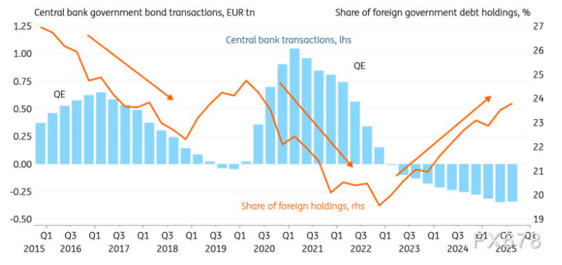 外国投资者的强劲需求可能会持续,因为目前的持仓量仍远低于量化宽松(QE)前的水平。在量化宽松之前,外国投资者持有的债务占总流通债务的比例超过27%,远高于目前的24%。最新数据显示,年度需求为2450亿欧元,仅次于欧元区银行。